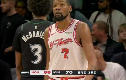 杜兰特三节14中3得15分申京22分,火箭落后森林狼2分进末节