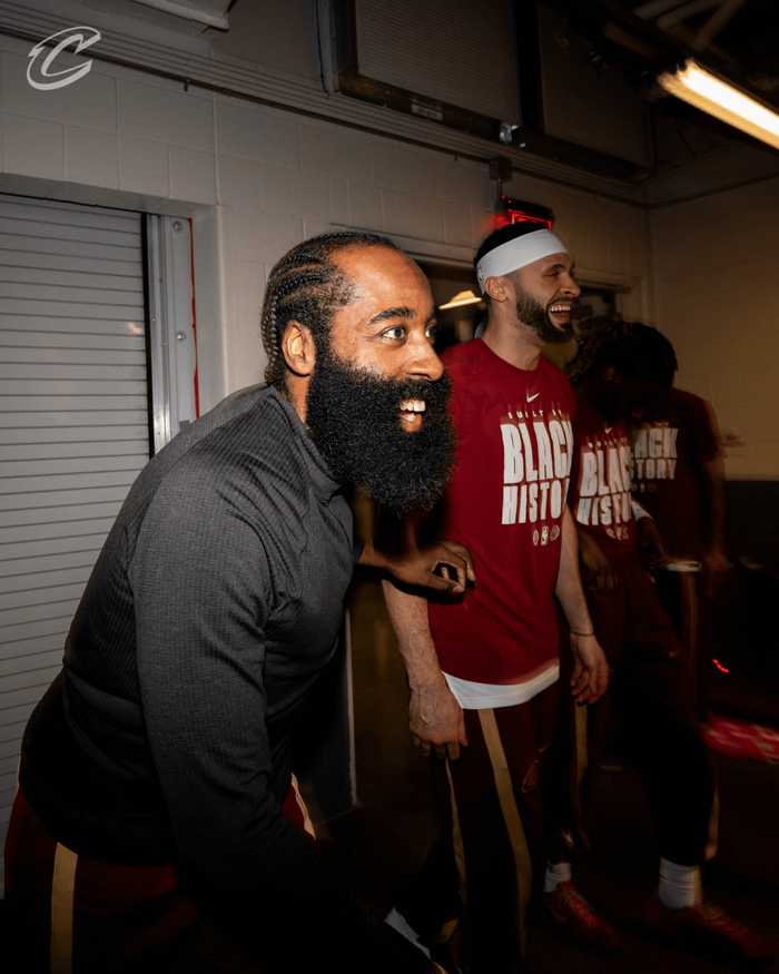 骑士队更新官方社媒,晒出詹姆斯-哈登在更衣室和队员们的照片。