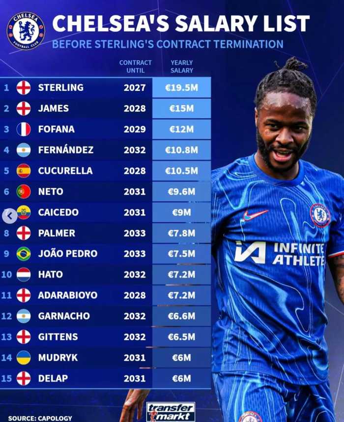 当地时间1月28日,切尔西官方宣布与斯特林协商解约。德转统计了在此之前,切尔西球员的薪资榜。