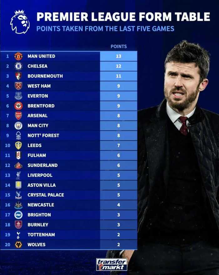 德转发布英超球队近期状态榜(近5轮拿分):曼联以13分领跑,成为过去五轮抢分效率最高的球队;切尔西12分紧随其后,伯恩茅斯以11分位列第三。西汉姆、埃弗顿、布伦特福德同积9分并列其后,阿森纳、曼城和诺丁汉森林则以8分处在追赶集团。